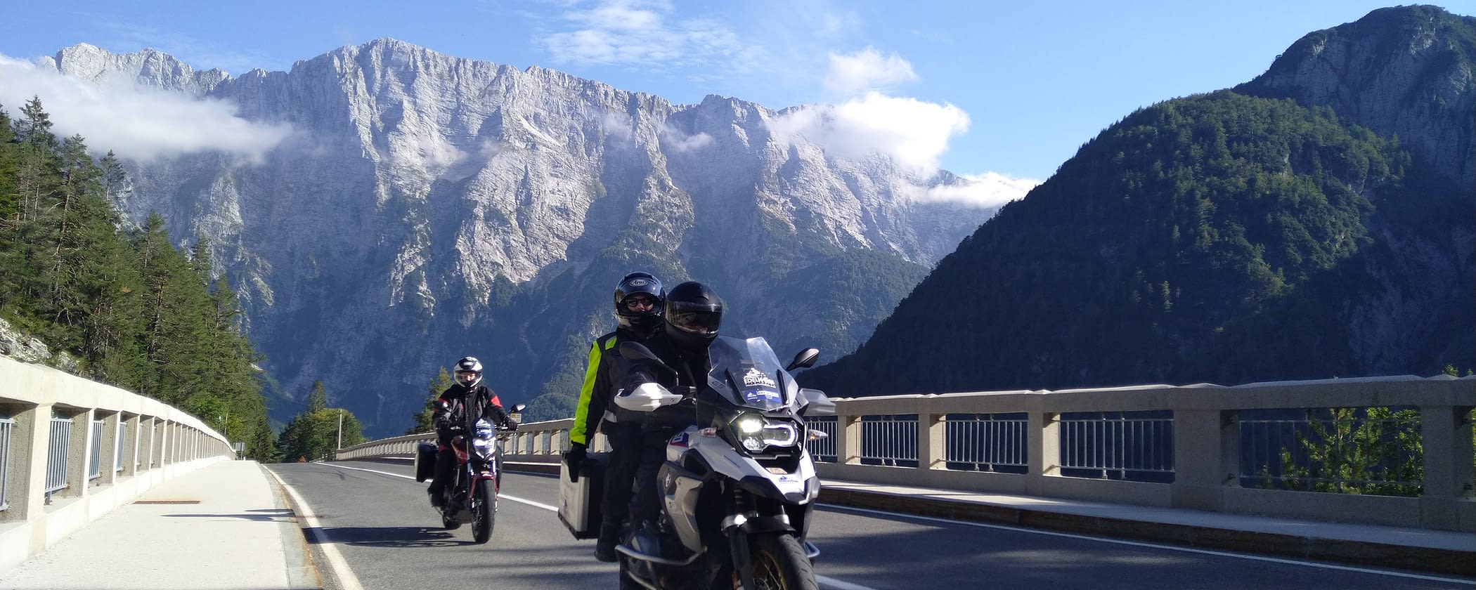 Welcome to our first day of riding. Touring center means yes we always stay in the same hotel and drive every day in a different direction. Today we are mainly going to Slovenia. The weather is excellent. And the day is rather rider focused. So what should go wrong. In the morning we take our first pass under the wheels, the "Loibl Pass" this leads us to Slovenia. There we will spend most of the day. After a stop at a monument to the probably most important part of European history of the 20 century, we continue to Bled, where our first coffee is waiting for us. After that we enjoy the view of the only island in Slovenia. 1001 curves and 1 pizza later we reach a viewpoint which gives us a great view over the Soca valley. Another 1000 curves later we climb the Mangart road. Spectacular and challenging at the same time....... oh man there would be soooo many things to tell...... what a day Willkommen zu unserem ersten Fahrtag. Tourencenter meint ja wir bleiben immer im selben Hotel und fahren jeden Tag in eine andere richtung. Heute nehmen wir uns hauptsächlich Slowenien vor. Das Wetter ist Ausgezeichnet. Und der Tag ist eher rider fokusiert. Also was soll schon schief gehen. Am morgen nehmen wir also unseren ersten Pass unter die Räder, den "Loibl Pass" dieser führt uns nach Slowenien. Dort werden wir die meiste Zeit des Tages zubringen. Nach einem Stop an einem Denkmal zum wohl wichtigsten Teil Europäischer Geschichte des 20Jahrhunderts, fahren wir weiter nach Bled wo unser erster Kaffee auf uns wartet. Danach genießen wir die Aussicht auf die einzige Insel Sloweniens. 1001 Kurven und 1 Pizza später erreichen wir einen Aussichtspunkt welcher uns einen großartigen Blick über das Soca Tal gewährt. Weitere 1000 Kurven später erklimmen wir die Mangart Straße. Spektakulär und Herrausfordend zugleich....... oh mann da wären noch soooo viele Dinge zu erzählen...... was für ein Tag