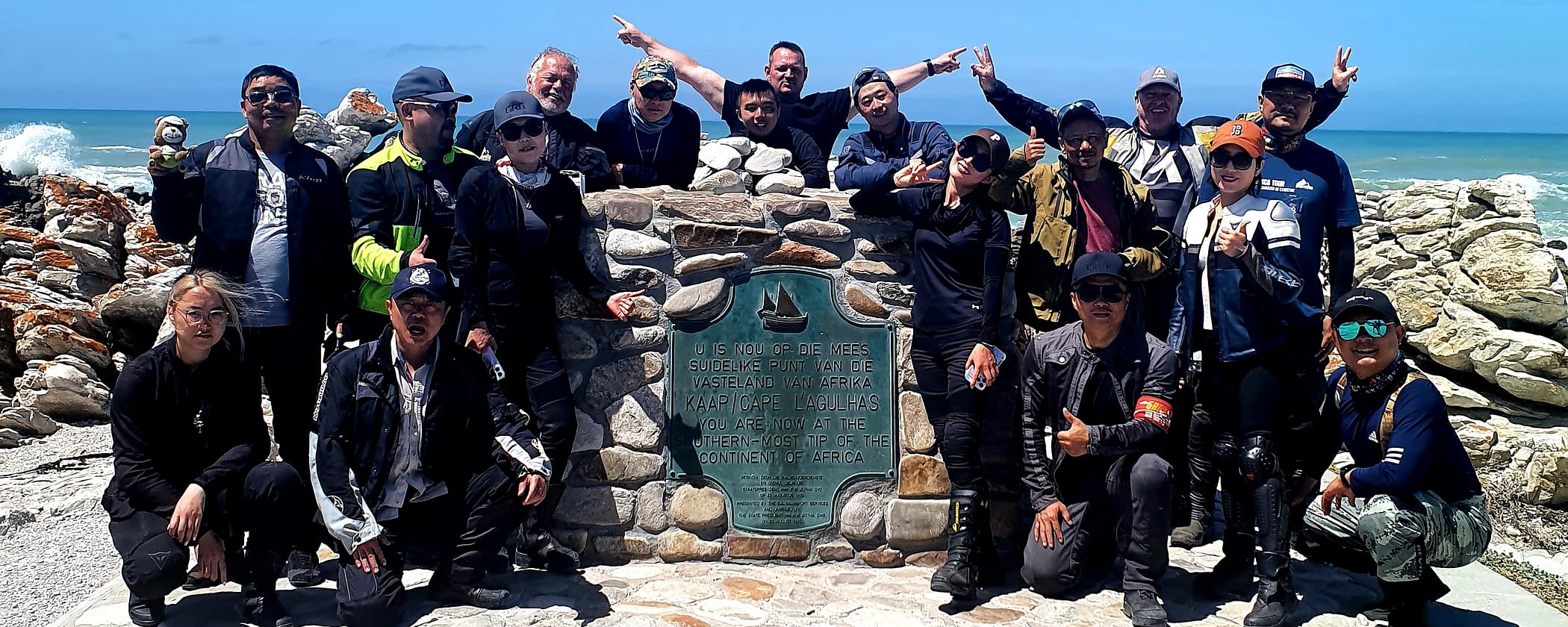 As we head out of Montagu in the morning it is already hot. We wind our way through the Klogmanskloof mountain pass but soon the hills are disappearing into our rear view mirrors and we enter into Wheat country. Here it's just km after km of wheat fields stretching into the horizon. It's all already harvested, but there's bales of straw everywhere in the fields, and some sheep are already out grazing on the stubble that is left over. These are the Merino sheep that the area is famous for and they must be hot because the temperature gague is already at 34 degrees!! After riding through many km's of wheat fields it eventually starts to thin out as we reach the coast and eventually we park up and walk to the marker denoting the southernmost point of Africa where the Indian and Atlantic oceans meet. After making the most of our photo opportunity we have a quick coffe and then head off towards Hermanus, where we stop by the cliffs for lunch. Unfortunately it's a little late in the season and there are no whales to see. We head north from here and we are still in the wheatlands, but eventually the wheat fields give way to fruit trees and we stop for refreshments in Villiersdorp. Then we have a great ride to finish the day over the Franschoek pass and arrive at our hotel. It's a rest day tomorrow so we can all relax.