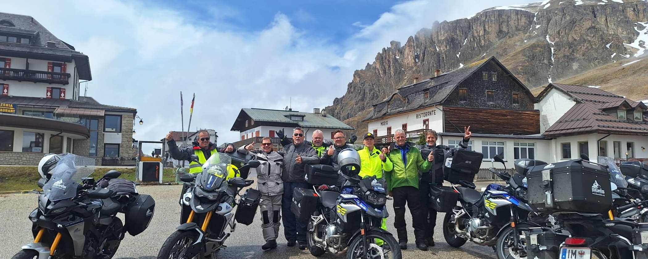 Nach der gestrigen Befahrung des höchsten Berges Österreichs machen wir uns heute auf nach Italien um eine der schönsten Berglandschaften der Welt zu erkunden. Die Dolomiten sind nicht nur durch ihre schroffe Schönheit der Bergspitzen bekannt sondern auch in Motorradkreisen für ihre einzigartigen Passstraßen und zahllosen Kehren. Zunächst führt uns der Weg aber über eine am Hang des Pustertals gelegene Panoramastraße die trotz oder gerade wegen der herumziehenden Wolken epische Weit- und Talblicke liefert. Nach dem Zelebrieren des Grenzübertrittes mit einem Fotostop, was wohl zu einer Gruppentradition wird, wird erst einmal die Wetterkenntnis des Guides auf die Probe gestellt. Alle sind mit der Einschätzung zufrieden und so rollen wir leicht gekühlt aber trocken am wunderschönen Misurinasee für eine erste Kaffeepause ein. Hier beginnt die Kurvenorgie und die ersten "Free Riding Sessions" werden über den Passo Tre Croci und den Passo Falzarego gestartet. Auf den anderen Pässen der bekannten Sella Ronda, die wir zum Teil befahren geht es durchaus flott voran und sogar einige unverhältnismäßig breite Reisebusse werden beinahe problemlos überholt was mitunter auch an dem gezielten Einsatz eines landestypischen akkustischen Signalgebers gelegen haben kann. Ein kleiner Regenschauer kurz vor Ende der Tour wäscht den Straßenstaub des Tages von den Bikes und die Fliegen vom Visier, so dass wir glücklich, sauber und zufrieden in der Hotelgarage parken und uns bis zum hervorragenden Abendessen auf Bar und Spa verteilen.