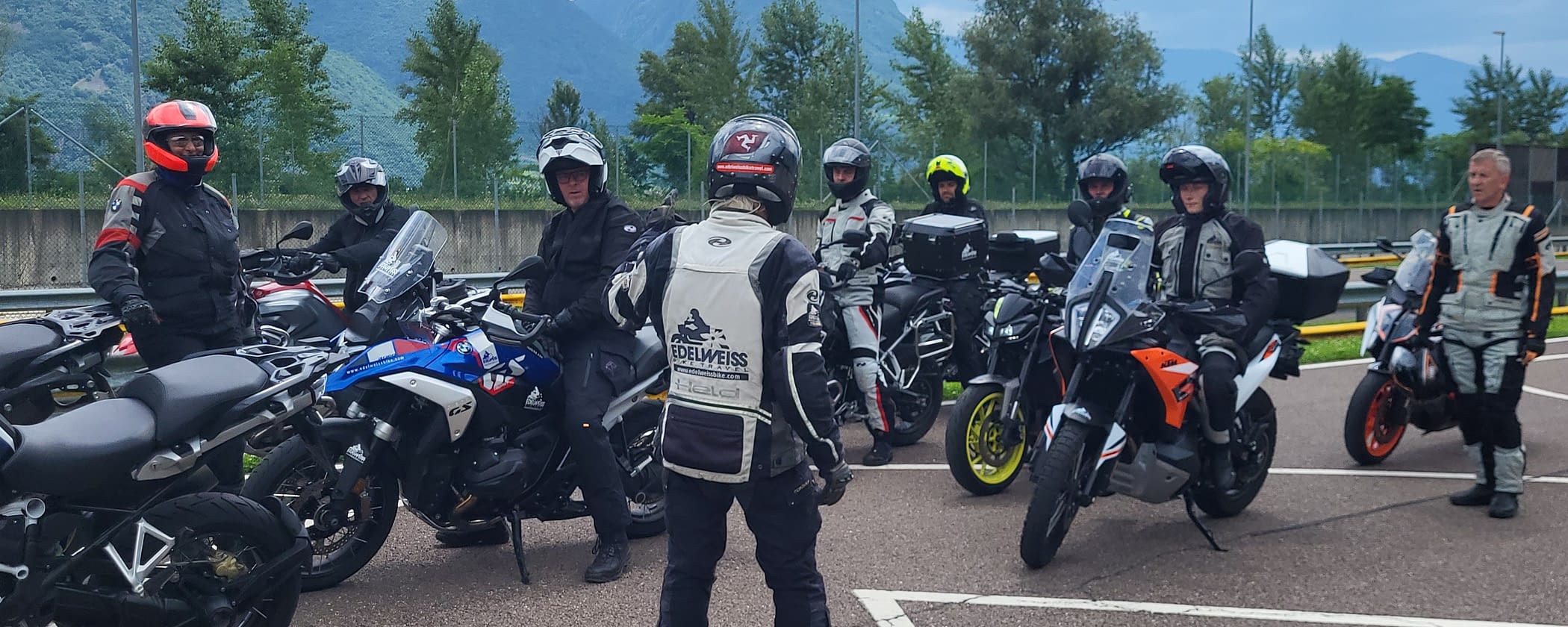 Am Morgen haben wir uns mit einem köstlichen Frühstücksbuffet gestärkt, das keine Wünsche offen ließ. Mit vollem Magen und guter Laune ging es weiter zum theoretischen Teil des Tages. Christian versorgte uns mit umfangreicher Theorie in Sachen Motorradfahren, sodass wir bestens vorbereitet in den Nachmittag starteten. Am Nachmittag fuhren wir zum Safety Park in Bozen, einem idealen Gelände, um unsere Fahrpraxis zu erweitern und zu perfektionieren. Hier absolvierten wir zahlreiche Aufgaben: Slalomfahren, Gefahrenbremsungen, Bremsen in der Kurve und natürlich das Finden der perfekten Kurvenlinie. Diese Übungen gaben uns das nötige Selbstvertrauen und die Fähigkeiten, um die restliche Tourwoche sicher zu meistern. Auf dem Rückweg zum Hotel zeigte uns Christian noch ein paar enge und durchaus herausfordernde Straßen rund um Bozen. Diese zusätzliche Praxis half uns, unsere Fähigkeiten weiter zu verfeinern und gab uns einen Vorgeschmack auf die Herausforderungen, die uns noch erwarten würden. Am Abend, nach einem sehr intensiven Tag, ließen wir den Tag mit einem gemeinsamen Abendessen ausklingen. Trotz der Erschöpfung waren wir alle zufrieden und freuten uns auf die kommenden Tage voller Abenteuer und neuen Erfahrungen.
