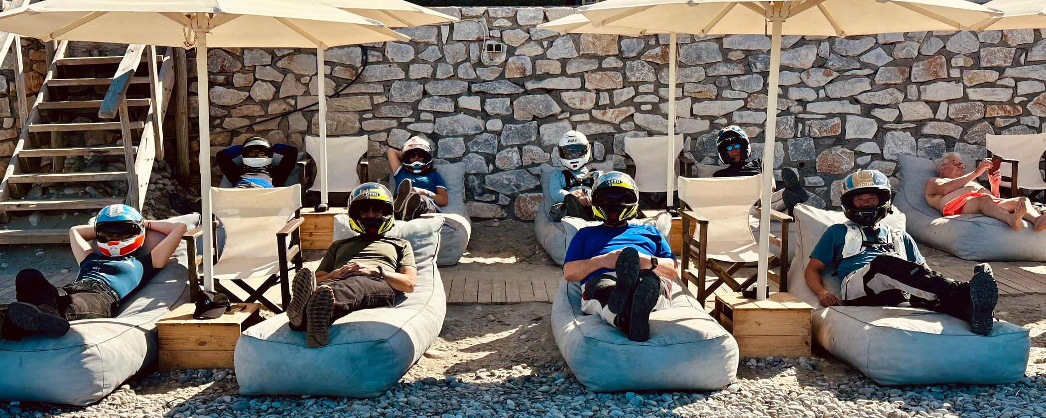 We start our day with a beautiful ride through the mountains, along the sea. The view down to all those sweet little islands and the beautifully blue water is just breathtaking. Yet we focus on our ride and the right riding line, as Richie and J.D. explained to us. The late apex! After a good ride we arrive at a cute cafe right at the beach of Neo Oitylo (fun fact, out of all the wonderful greek beaches our host Depi recommended this one to us yesterday, not knowing it was on our schedule already!). We enjoy a cold coffee, the sun, the sea! Should we just stay here? ... maybe not, we have some more highlights planned for today! Our lunch stop is right at the Dimitrios ship wreck. Before we sit down at the table we walk along the beach to see the mysterious ship up close! We arrive early in the hotel today, for two good reasons: 1. the pool of Kinsterna Hotel! It feels fabulous to jump in the cool water after a great ride! 2. we want to visit and discover the fascinating island Monemvasia. Some of us hiked up all the way to the top of the upper town, others went souvenir shopping in the little street, in the end we all meet up with a drink enjoying the breathtaking view! Oh! And we had Gelato of course! Now we are talking!