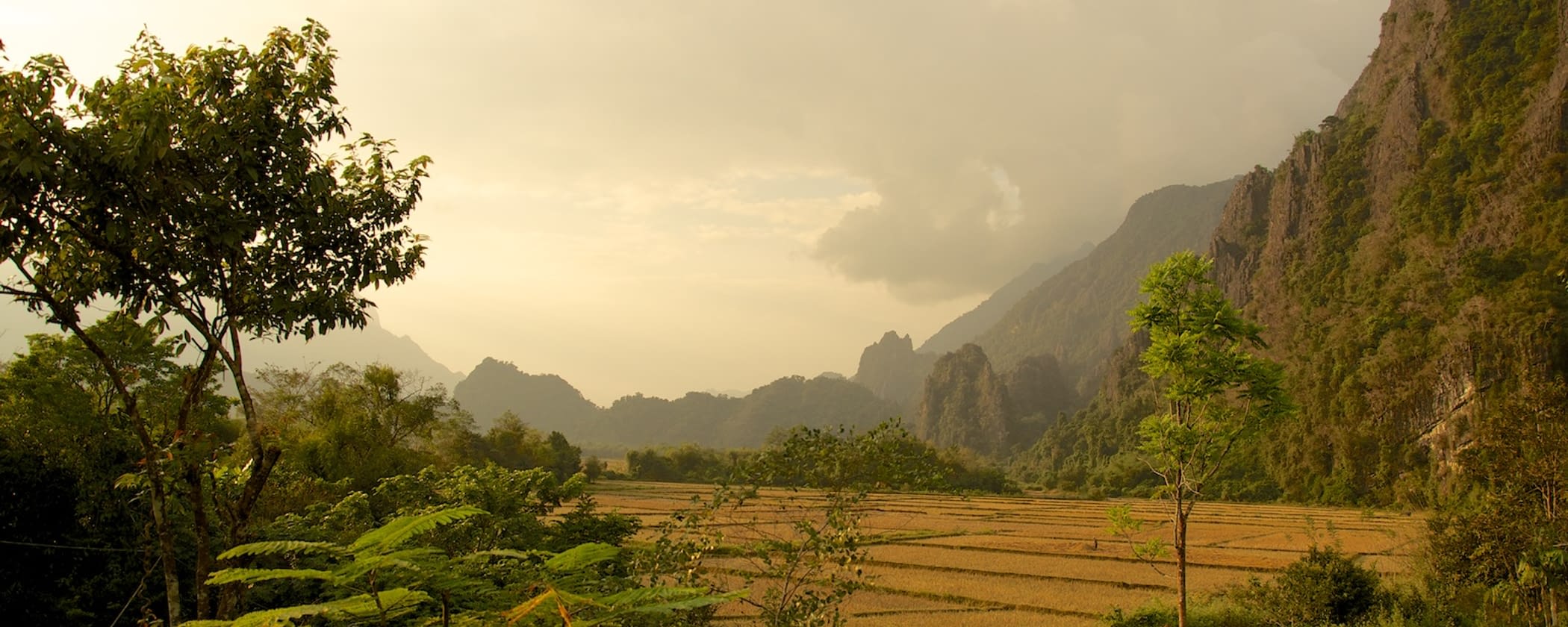 The prize for such an intense day is this sunset view over the rice fields and limestone mountains...
