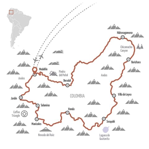Begib dich auf ein 15-tägiges Straßenabenteuer, das dich tief in das Herz der kolumbianischen Anden führt. Diese Rundreise, die in Medellín beginnt und endet, bietet eine reiche Mischung aus kurvenreichen Bergstraßen, kulturellen Begegnungen und spektakulärer Hochgebirgslandschaft.