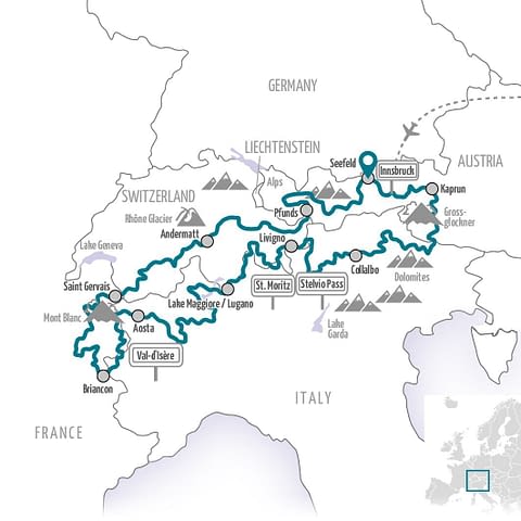 Die Alpen sind der Traum eines jeden Motorradfahrers und bei einer recht langen Tour, wie dieser hier, bekommt man einen sehr guten Eindruck davon. Die wichtigsten Alpenländer stehen auf dem Programm, Österreich, die Schweiz, Frankreich und Italien, hier warten die höchsten Pässe, die spektakulärsten Straßen und die gewaltigsten Panoramen. Hier sammeln wir Pässe wie andere Leute Briefmarken, die Crème-de-la-crème der weltbesten Motorradstraßen wartet auf uns, hunderte und aberhunderte von Kehren, eine schöner und spaßiger als die andere. Für einen erfahrenen Motorradfahrer ist das hier die Erfüllung!