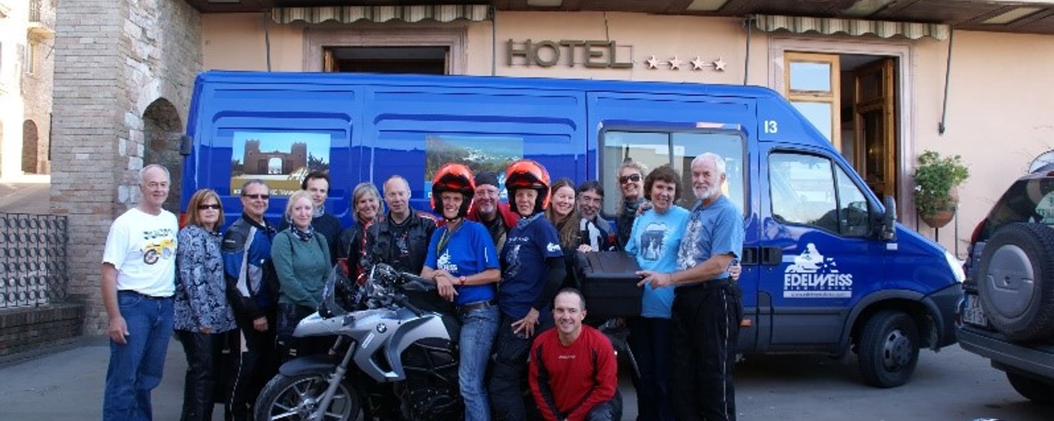 Once upon a time in Tuscany, Italy… It was one of these promising sunny days and we were on our way from Siena to Assisi. It was my turn to guide our group on the motorcycle. And my co-worker Ursula, to whom I owe much of my basic experience, was responsible to put up the famous Edelweiss picnic on that day. After we had arrived at the agreed place around lunch time we were surprised by a dark cloud signalizing that the weather would very soon change from the idyllic scene to a rainy mess. So we enjoyed Ursula’s delicious delicacies and then helped her to quickly put everything back in to the support vehicle. As if scheduled, the heavens opened up, and it was raining buckets precisely at the moment when we were closing the doors. Just before the rain fully blocked my view, I could see in the distance that there was still a dry spot. So I decided to continue with the riders into this direction. At this point in time it was raining so hard that the only thing I could see was the headlights of the motorcycles. As soon as I could make out the right number of headlights I started riding. Shortly after that we returned back to dry roads, which made me stop by the side of the road to make sure the group was complete and everybody was okay. But what was this? I couldn’t believe what my eyes saw: At one of the BMW 1200 RTs the right side case was popped wide open. And to make it even worse – the lady passenger, who I thought had been sitting on this very motorcycle just before, was missing now!! Coming here, we had been riding on a road along a steep slope, basically without any visibility. Could it be that the poor woman had been falling off the motorcycle? Sheer horror must have spoken out of my face. When I asked the rider if he was aware that he had “lost” his wife, he looked at me cheerfully and informed me that his wife, at the very last moment, had changed her mind and had joined Ursula in the van (which I couldn’t possibly have seen because of the heavy rain). She was safe and sound and on her way to our next hotel by now. Jolly glad that the horror scenario in my mind could vanish into thin air, I closed the lid of the RT’s side case and joined in the laughter.