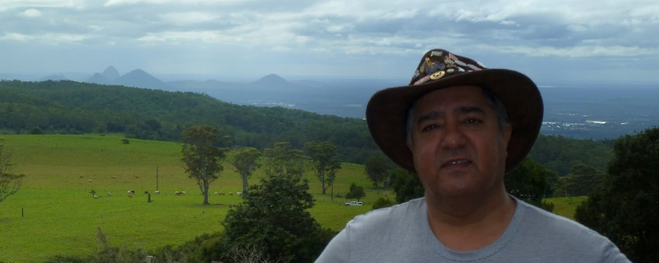The volcanic crags in the background behind Abdullah were named Glasshouse Mountains by James Cook, who sailed past this coast in 1770. It's a beautiful view despite the clouds.