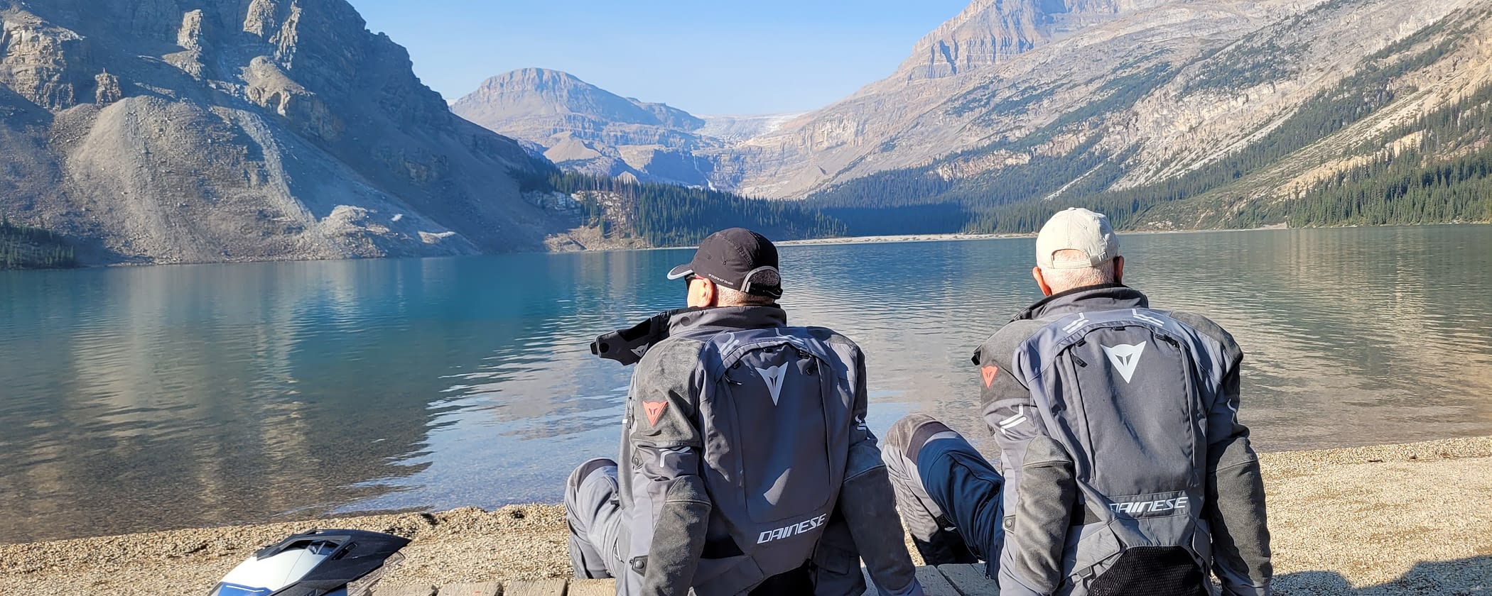 that's no wallpaper Good morning Lake Louis, The day welcomes us with the best weather, The rains of the night have disappeared. The air is clear and clean. So it should be because today we face one of the, scenic, most spectacular roads in the world. The Icefields parkway. The road leads us all day through the spectacular landscapes of the Canadian Rockies. One would like to stop every 2 kilometers and take pictures. If not behind the next corner already again the next spectacular panorama would wait. We make several stops to immortalize the complete range of the seen on photos, lakes, landscape, the impressive glaciers of the Columbia Icefield, as well as beautiful waterfalls. This is the full load of Canada. What a day