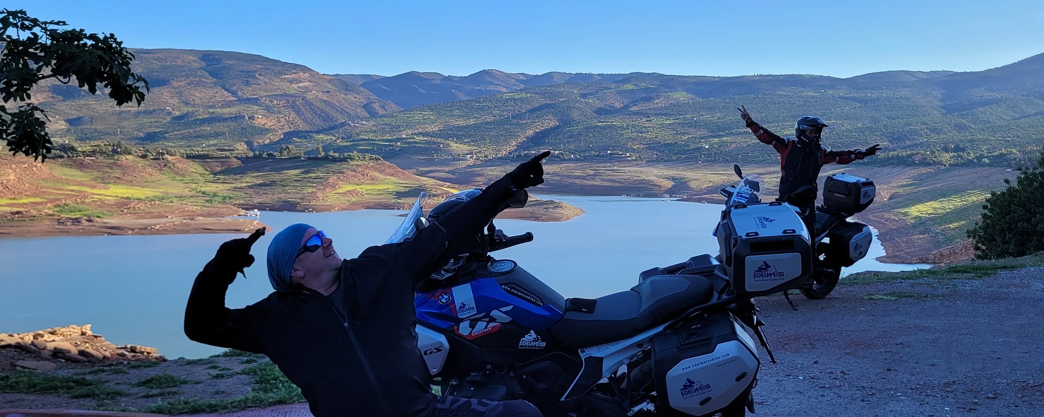 Morocco - off the beaten Tracks We already knew from the first few days we spent here that Morocco has much more to offer than just desert landscapes. However, it never ceases to amaze us how varied the landscape is in this North African country. Right after our start this morning, we drove just a few kilometers and suddenly found ourselves in the middle of a beautiful cedar forest with trees up to 40 meters high. However, the trees were not the reason why we took this little detour, but the Barbary macaques living there, the only macaque species outside Asia. They are not only cute to look at, but also extremely trusting and have no inhibitions about approaching a group of motorcyclists to see if they have brought something for them to eat. We then drove on through a beautiful mountainous landscape to Khenifra where we were served a sumptuous Moroccan lunch. Afterwards, the group split up and a small part chose the relaxed route to our hotel in Bin El Ouidane. The rest of the group decided to take the more challenging route on the other side of the mountains and were rewarded with even more beautiful bends.