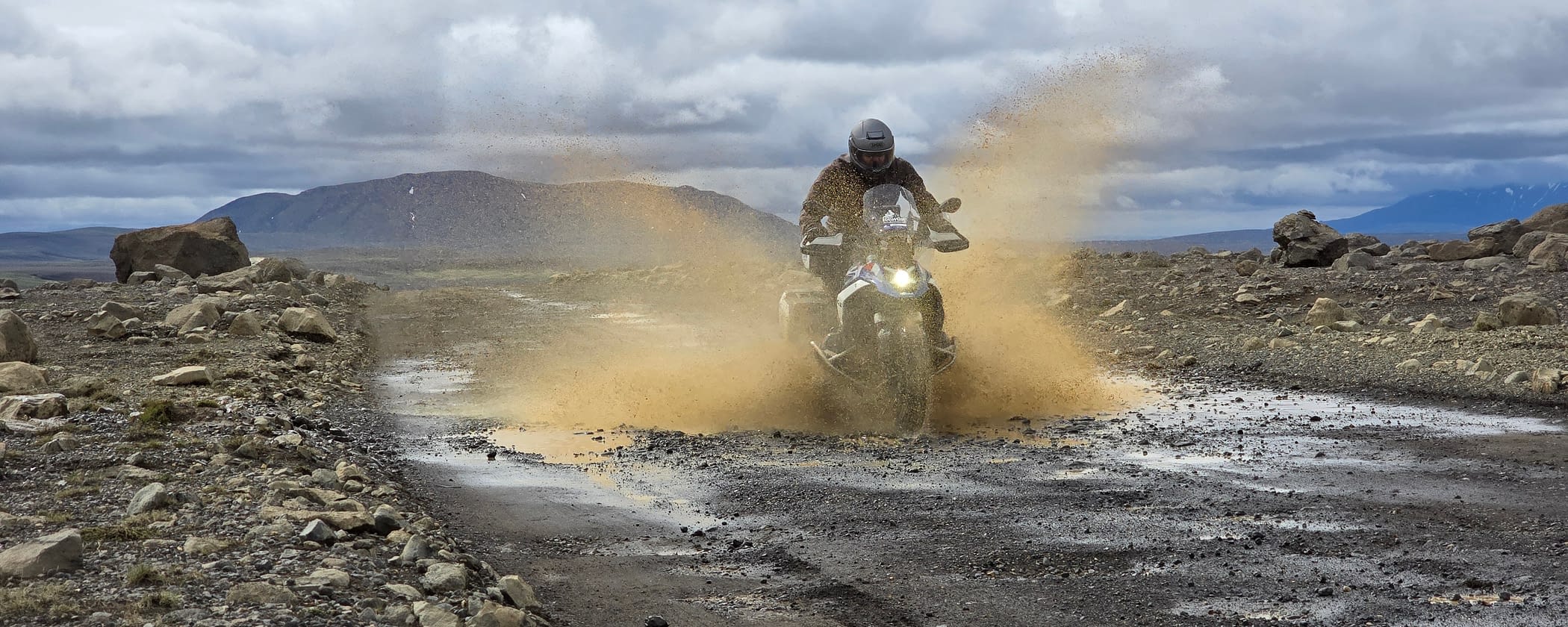 For the first time on our tour, it looks like we have little luck with the weather. Normally we should be able to admire glacier tongues from our rooms. But hey, that's Iceland too. There's probably an indoor briefing today;-) And so we set off on today's journey. Our first destination is the Jökulsárlón glacier lagoon, where a ride on an amphibious vehicle awaits us. And despite the uncomfortable weather, we get a good impression of why this place is so special. Gradually, however, we have had enough of the miserable weather, the nature around us sinks into the fog, what a pity. A few kilometers later we have the opportunity to warm up a little, we have burgers and soup and the rain lets up. And then we do get the chance to take a look at part of Vatnajokul. A short hike is necessary to admire the glacier tongue in all its glory, but it's definitely worth it. Less than an hour later we reach our hotel. That's how it should be because we want to end the day with a little adventure on the gravel, the weather looks great so GO! The route is twistier and more challenging than the days before, real fun. However, due to flooding in the region, the rivers are carrying too much water this time to cross them with our bikes. A very special surprise awaits us in the evening;-)