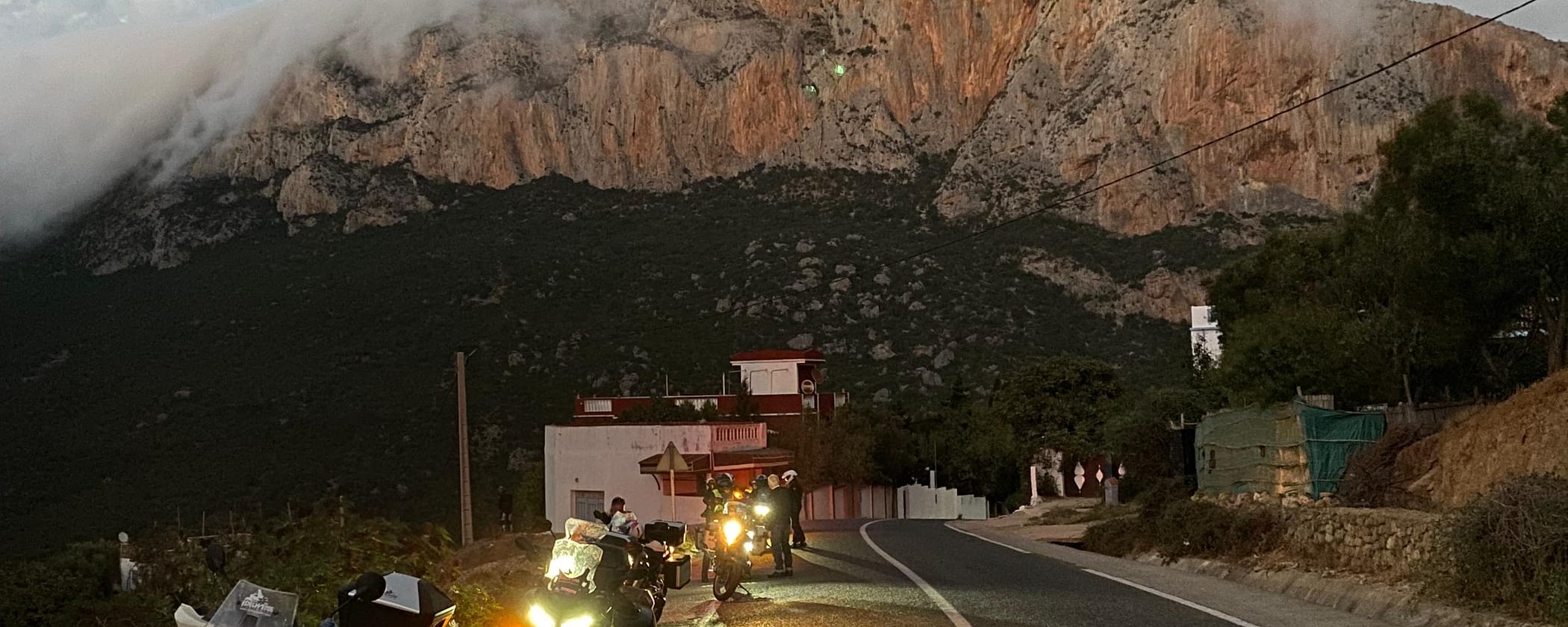 The journey from Málaga to Chefchaouen was long and exhausting, but filled with anticipation and excitement. After crossing the Moroccan border at Ceuta, we made our way to M'diq for a well-deserved late lunch stop. The delicious Moroccan flavors revitalized us as we prepared for the next leg of our journey. As we headed south, we encountered some incredible sweeping curves along the coast. However, some fog and some raindrops obscured the stunning ocean views, preventing us from fully savoring the breathtaking scenery. Despite the weather, the winding roads offered thrilling riding experiences that kept our spirits high and our exhausts humming. Finally, as the day wore on, we arrived at our riad in Chefchaouen, the enchanting blue city nestled in the Rif Mountains. Although it was late, we were treated to a delicious Moroccan meal that warmed our hearts and filled our bellies. The flavors of the region and the inviting atmosphere of the riad made us feel right at home, setting the stage for our exploration of Chefchaouen and beyond.