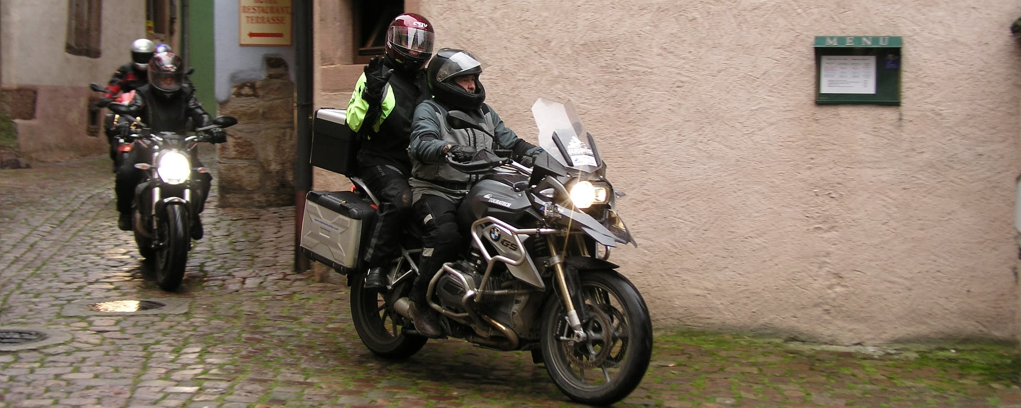 Sunday morning in Heidelberg. All is quiet. No traces of the parties that have been going on until late at night in this lively university town. 12 motorcyclists start their engines and ride along a misty road along the river. After a stretch of highway riding, the Black Forest awaits the group with its twisty roads and beautiful scenery. The clouds today hide some of it, but this adds to the beauty of the place. A little rain at the end can't spoil the fun. Ahead lies a rest day in France.