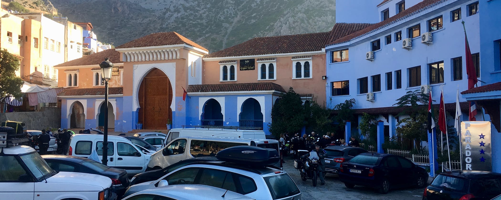 We are in Morocco!! Today we went off in the Spanish enclave of Ceuta in the early morning with 26 persons on 18 bikes and a support van towards the Moroccon border. Since we were there early the border crossing procedure went very smooth......also thanks to Pablo's great knowledge of the French language!. There is a rumour going on that he will be hired as "helper" by Moroccon customs ;-) After a nice long coffeebreak along the seaside we went on the excellent coastal road towards Oued Laou, where a nice seafood lunch was prepared for us. And after the last free riding part through the wonderfull valley towards Chefchaouen, the riding part of the day was done! Before our dinner everyone took the opportunity to stroll around in the souk of the Blue City Great day!