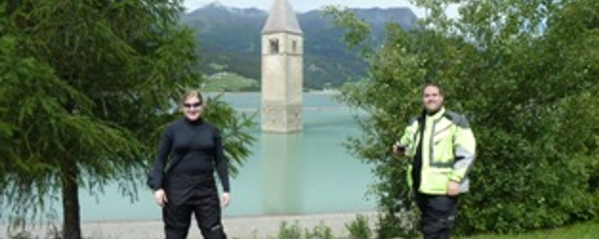 Kelly, Brian and the flooded church at Reschensee