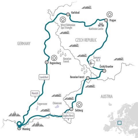This relaxed tour takes you from Mieming via Regensburg and Karlovy Vary to Prague and Cesky Krumlov.