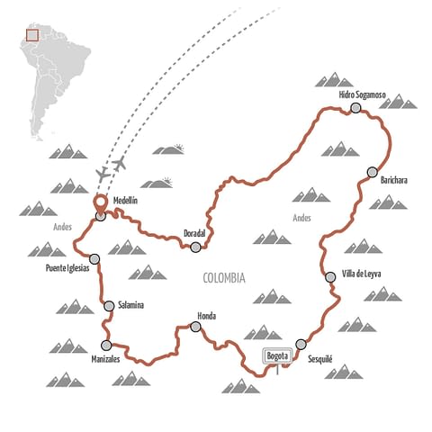 Set off on a 15-day road trip deep into the heart of the Colombian Andes. This round-trip journey, which begins and ends in Medellín, features winding mountain roads, cultural encounters and stunning high-mountain vistas.